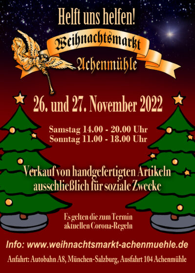 Die Öffnungszeiten des Achenmühler Weihnachtsmarktes sind am Samstag von 14 Uhr bis 20 Uhr und am Sonntag von 11 Uhr bis 18 Uhr. Angeboten wird – so Vereins-Vorsitzende Sylvia Steiner ein mit viel Liebe und in ehrenamtlicher Arbeit hergestelltes reichhaltiges Sortiment. In der Hauptsache werden von Frauen und Männern handwerkliche, gebastelte und gestrickte Sachen, aber auch regional erzeugte Lebensmittel angeboten. Oftmals finden sich dabei richtige Unikate zur Freude von Liebhabern oder als passende Geschenk-Idee für das bevorstehende Weihnachtsfest. Auch für volksmusikalische und kulinarische Genüsse wird an beiden Markttagen gesorgt sein. Ganz bewusst wird auf gewerbliche Anbieter verzichtet. Die Erlöse aus allen Marktständen kommen in einen großen Spendentopf zugunsten sozialer Einrichtungen und für hilfsbedürftige Menschen. Der Veranstalter weist noch darauf hin, dass die zum Termin gültigen Corona-Regeln Gültigkeit haben.