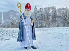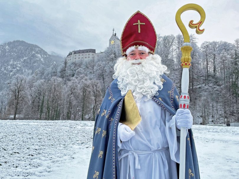Der Nikolaus ist auch heuer im Auftrag der Aschauer Kolpingfamilie in Aschau und Sachrang unterwegs. Im Hintergrund erstrahlt der Stern der Hoffnung mit 4,5 Meter auf Schloss Hohenaschau. Der Erlös vom Nikolaus-Gehen in Aschau i.Chiemgau und Sachrang kommt einen wohltätigen Zweck zugute.