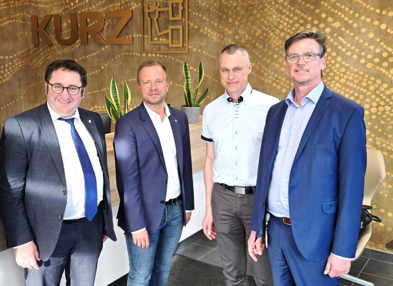 Bericht und Foto: Bayerisches Staatsministerium für Wirtschaft, Landesentwicklung und Energie / Staatssekretär Tobias Gotthardt (erster von links) hat die Leonhard Kurz Stiftung & Co. KG besucht.