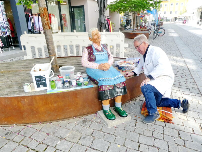 Wer kennt sie nicht, die stets zufrieden-lächelnde Oma in der Priener Bahnhofstraße. Fast laufend lädt sie Bürger und Gäste, Klein und Groß ein, sich neben ihr eine Verschnaufpause zu gönnen. Und immer wieder ergeben sich willkommene Foto-Motive. Doch zum wiederholten Male wurden Ruhe und Aussehen von böswilligen Zeitgenossen gestört. Und zum wiederholten Male legte Ehren-Oberleutnant Paul Panzer von der Priener Gebirgsschützenkompanie ehrenamtlich Hand an, damit die Oma wieder rundum glänzt.
