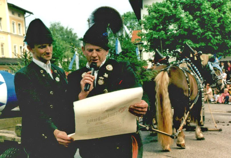 Archiv-Foto: Hötzelsperger – Atzinger Trachtenvorstände Albert Rauch und Jakob Steiner im Jahr 2000 beim Verlesen der Urkunde anläßlich des Maibaumaufstellens in Aschau i. Chiemgau, die Urkunde erstellte Ernst Reiter aus Prien-Atzing.