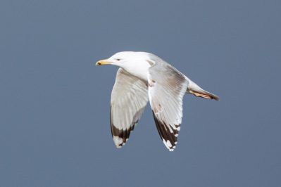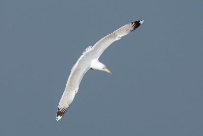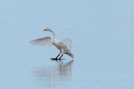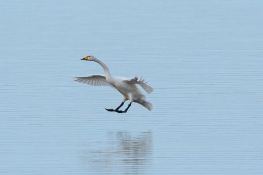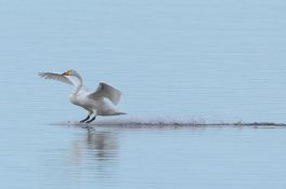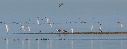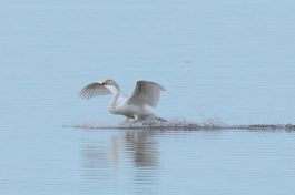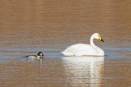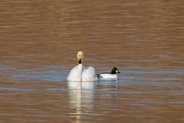 Leider waren bei dann schönstem Fotolicht in der Hirschauer Bucht nur wenige Wasservögel und keine Greifvögel unterwegs. Ein vereinzelt ankommender Singschwan legte eine mustergültige Landung hin und akzeptierte dann bei der Nahrungssuche einen Schellentenerpel als Begleiter, der das von dem gründelnden Schwan auf gestrudelte Plankton erntete. Mehre Steppenmöwen kreisten Nahrung suchen über der Bucht. Durch den fallenden Wasserstand im See tauchten Steinbuhnen und Kiesbänke als Futterspender im Flachwasserbereich der Bucht wieder auf, die von zahlreichen Brachvögeln, eifrig mit dem langen Schnabel nach Fressbarem stochernd, aufgesucht wurden.