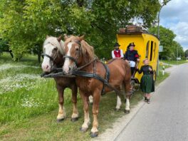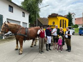 Gut unterwegs ist die Historische Postkutsche auf ihrem Weg von Regensburg zum Samerberg. Am dritten Tag erreichte Kutschenbauer und Samer Michael Sattlberger senior mit seinem Begleitteam unter anderem die Weinstube Huber in Hebrontshausen ehe es zum Markt Nandlstadt in der Hallertau weiterging. Mit dabei waren als Kutsche Hubert Kirchmair und Didi Kraus sowie als Begleiter Marianne Stadler und Fritz Kern. Die Mittwochs-Tour führt 35 Kilometer von Nandlstadt nach Aufkirchen bei Erding.