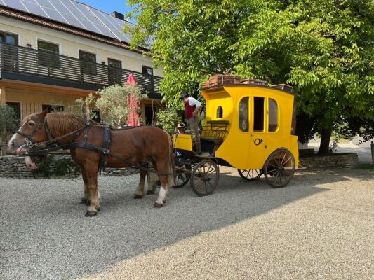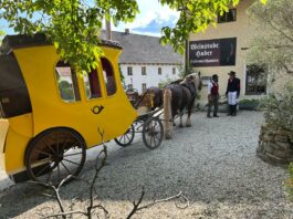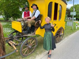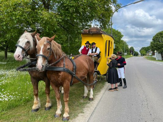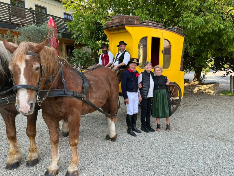 Fotos: Sattlberger – Eindrücke vom dritten Streckenabschnitt der Historischen Postkutschenfahrt von Regensburg zum Samerberg mit Halt beim Huberwirt in Hebrontshausen – u.a. mit den Kutschern Hubert Kirchmair (li.) und Didi Kraus sowie mit den Begleitern Marianne Stadler und Fritz Kern.