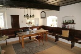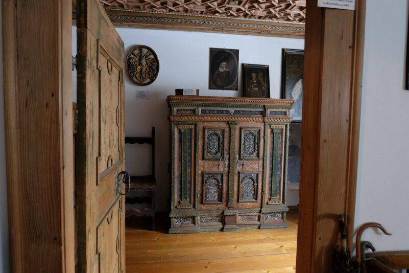 In dem Haus mit dem großen Walmdach und dem Fresko über der Tür entdeckt man Funde zur Ortsgeschichte, bäuerliche Möbel und wertvolle Handwerkssammlungen. So kann man beispielsweise die vollständig rekonstruierte Werkstatt eines Fassbinders und eine umfangreiche Sammlung mit Blaudruckmodeln alter Aiblinger Färbereibetriebe bewundern. Außerdem befindet sich hier die sogenannte „Marbacher Stube“ mit ihrer Renaissance-Einrichtung und Kassettendecke. Einen Höhepunkt aber bietet die sogenannte „Leibl Stube“. Der Vorsitzende des Historischen Vereins, Dr. Wolfgang Bloch, erklärt: „Diese Stube ist die Originalwohnstube von Wilhelm Leibl, in der er einst lebte und arbeitete. Der Maler wohnte zusammen mit seinem Freund Johann Sperl in Kutterling bei Bad Feilnbach. Tatsächlich wurde diese Stube aber bald nach dem Tod des berühmten Malers, der ja in Köln geboren wurde, demontiert und in seine Geburtsstadt verbracht. Als Geschenk des damaligen Oberbürgermeisters von Köln und späteren Bundeskanzlers, Dr. Konrad Adenauer, kam dann 1932 die Stube als Geschenk nach Bad Aibling zurück.