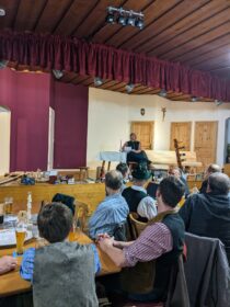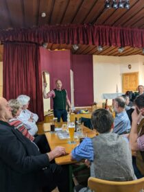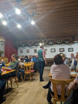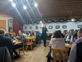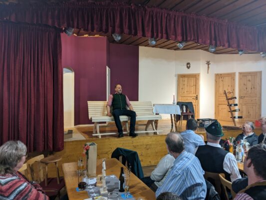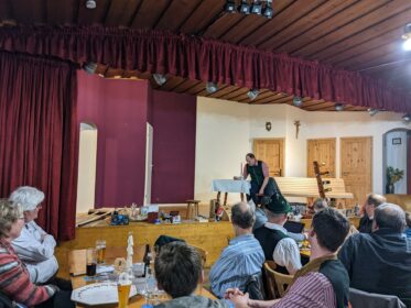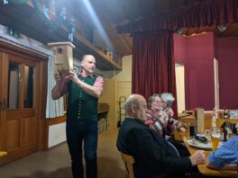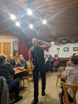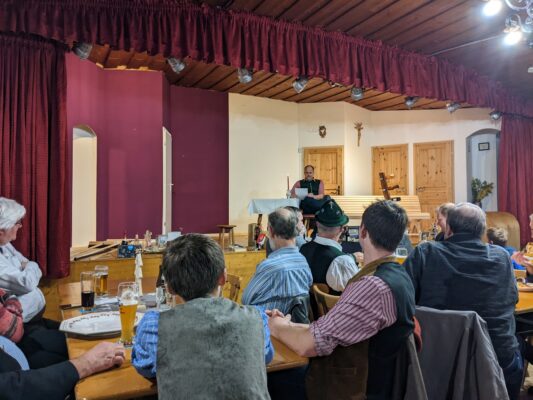 Obwohl genauso viele Leute mitsteigerten als sonst, konnte das für größere Veranstaltungen ausgelegte Trachtenheim daher nicht ganz ausgefüllt werden. Das tat aber der Stimmung und der Spenden- bzw. Steigerungsbereitschaft bei der kurzweiligen Veranstaltung keinen Abbruch. Josef Wörndl fungierte auch diesmal wieder gekonnt und humorvoll als Versteigerer und konnte eine Vielzahl an einfallsreichen Spenden unter die Leute bekommen. Für Abwechslung sorgte er zwischendurch mittels einigen Witzen sowie einem humoristischen Gedicht, welches aktuelle politische Themen wie die Energiewende aufgriff.