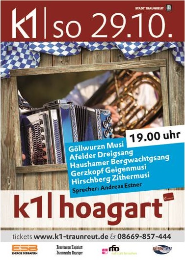 Griabig wird´s am Sonntag, 29. Oktober, wenn im k1 in Traunreut ab 19 Uhr unter dem bewährten Motto „Bei uns dahoam“ bodenständige Volksmusik erklingt. Fünf Gruppen aus Bayern und dem Salzburger Land werden die mittlerweile 6. Hoagart-Auflage auf der großen k1-Bühne gestalten. Die Besucher können sich diesmal auf die Göllwurzn Musi aus dem Tennengau, den Afelder Dreigsang aus der Wildschönau, dem Haushamer Bergwachtgsang aus dem Oberland, der Gerzkopf-Geigenmusi aus dem Pongau und Chiemgau und auf die Hirschberg Zithermusi, ebenfalls aus dem Chiemgau, freuen. Die eingeladenen Gruppen repräsentieren eine gelebte Volksmusik im allerbester Weise. Durch den Abend führt gekonnt Anderl Estner, selbst Erzmusikant bei da „Weißengroana Tanzlmusi“ und BR-Radiosprecher im „Heimatspiegel“ sowie vielen Volksmusiksendungen auf dem neuen digitalen Sender „BR Heimat”. Dieser Abend mit echter und unverfälschter Volksmusik wird wieder ein unvergesslicher Abend der gelebten Volkskultur!