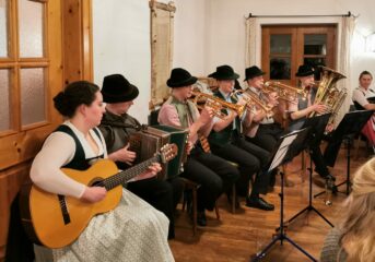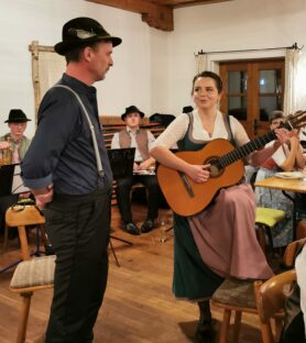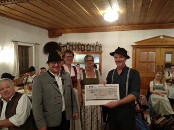 Bei leckeren Brotzeiten und Getränken durften alle Anwesenden dem abwechslungsreichen Programm “zulosen”. Mit dabei waren heuer die ReDur Musi aus dem Achental, die Huber-Dirndl aus Wildenwart, das Gesangsduo Taffertshofer-Babel und die Rarbeinand Musi. Durch den Abend führte in bekannter lustiger aber auch informativer Weise Ansager Sepp Furtner. Neben den Vorstellungen der einzelnen Musikgruppen zeigte er zum Beispiel auf, welche Vielzahl an bayerischen Wörtern ihren Ursprung im Französichen haben, und woher das Schafkopf-Spiel seinen Ursprung hat. Zusätzlich zu all den tollen Musikstücken und Geschichten gab es noch eine Überraschung für alle Anwesenden, im speziellen aber für Florian Babel (Sänger beim Gesangsduo Taffertshofer-Babel): Die Vorstandschaft des Trachtenvereins übergab ihm als Geschäftsführer der “Sternstunden” einen Spendenscheck über 750,00 Euro für das jüngst wieder erfolgreich aufgeführte Hirtenspiel, bei dem Florian außerdem den Josef darstellte. Nach dem offiziellen Ende gab es noch einiges an Zugaben der Musikanten und auch danach ging es noch einige Zeit lustig her im Trachtenheim.