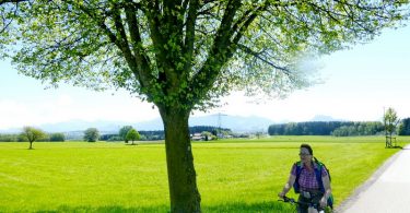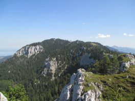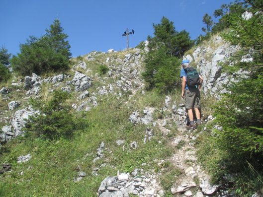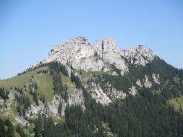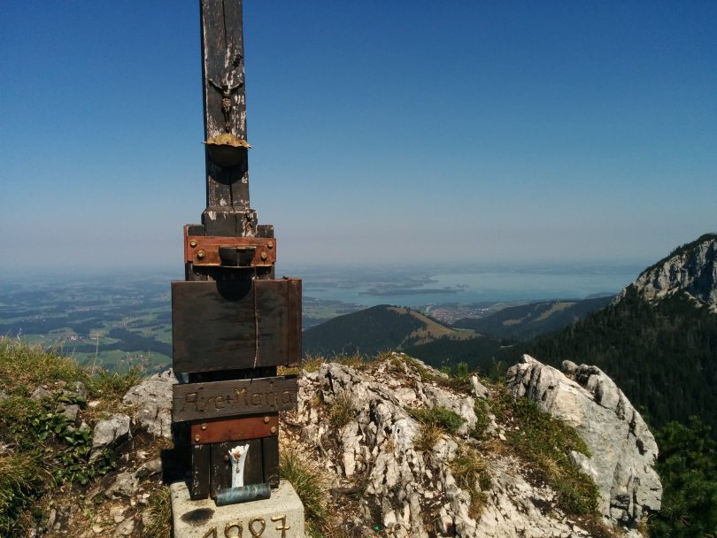 Auf eine Einkehr verzichten wir schweren Herzens, denn wir wollen zuerst auf den Gipfel. Von der Hofbauernalm gehts ohne Markierung einfach gerade die Wiese hoch bis zum Waldrand, wo wir das Schild „Zum Gipfelkreuz“ suchen und auch finden. Ab hier dann gehts auf gut erkennbarem Steig (Trittsicherheit erforderlich) weiter zum Gipfelkreuz , an dem wir nach insgesamt 2 1/2 Stunden stehen und die grandiose Aussicht über das Alpenvorland bis hinüber zum Chiemsee genießen.