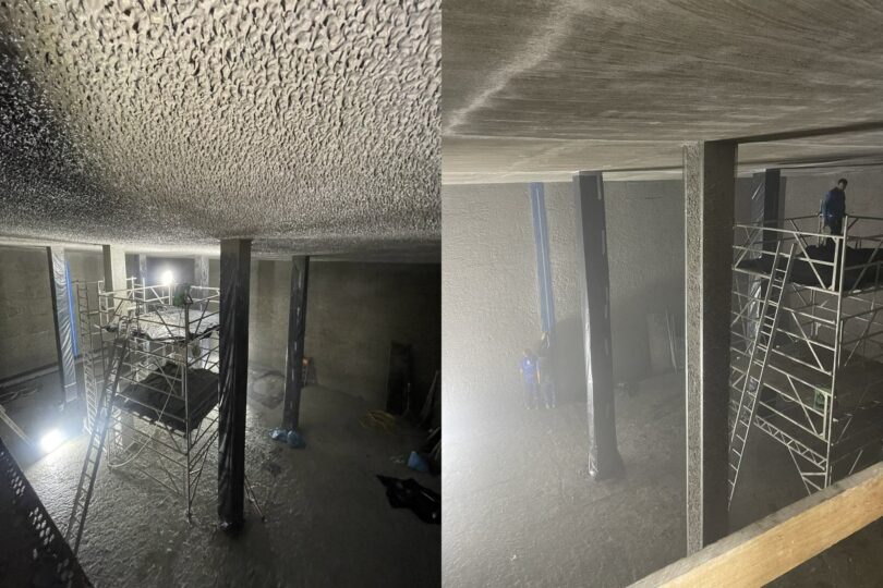 Nachdem die Betonoberfläche mittels Hochdruckwasserstrahl freigelegt wurde und festgestellte Risse sowie Dehnfugen vorbehandelt wurden, folgt nun die Neubeschichtung durch das Auftragen des mineralischen Mörtels an die Oberflächen. Bei der aufwändigen, von Hand auszuführenden Beschichtungsarbeit liegt das Augenmerk auf eine ausreichende und gleichmäßige Schichtdicke. Die Decke wurde mit einer Tropfenstruktur ausgestaltet, um die Oberfläche zur Kompensation des Kondenswassers zu vergrößern.