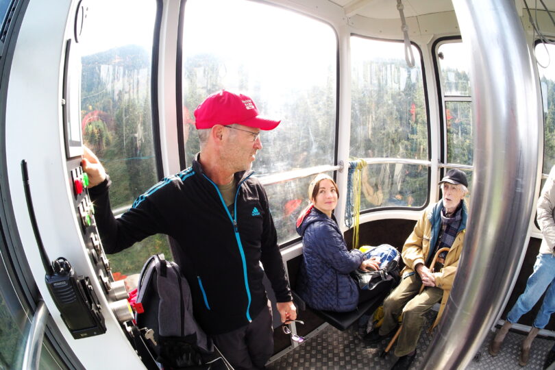 Noch grünen die Almwiesen unter der gemächlich dahinziehenden Sesselbahn. Kühe lagern dort und kauen wieder, während auf dem steinigen Serpentinenweg Mountainbiker in Kolonnen gemächlich downhill rauschen – nicht rasen. Doch warum sind so wenige Wanderer unterwegs an diesem schönen Tag? Und wo sind die Drachen- und Gleitschirmflieger, die sonst in den Aufwinden an diesem Vorposten der Alpen ihre Runden ziehen? „Wahrscheinlich wegen der Föhnstürme, die heute früh im Rucksackradio angekündigt wurden,“ vermutet der Pilot der Gondel, in die wir an der Mittelstation umständlich umsteigen müssen – so umständlich wie eh und je.