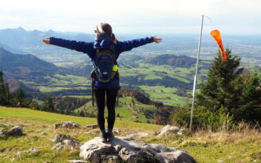 Den Aufstieg von der Bergstation zum bewirtschafteten Gipfelhaus, das gerade 110 Jahre alt geworden ist, schaffe ich mit meinen 95 Jahren nur bis zur ersten Wegkreuzung. Thomas und Tania müssen den Rest des Weges alleine gehen. Währenddessen strecke ich mich auf einem bemoosten Stein aus, wie Goethe in der Campagna, und genieße den „grandiosen Blick“, den der Prospekt verspricht: südwärts bis zum Großvenediger, nördlich zum flimmernden Chiemsee mit seinen Inseln – die ich heute eigentlich besuchen wollte, wenn nicht Lino plötzlich an Corona erkrankt wäre. Bald ziehen Nebelschleier auf, und mit ihnen kommen Erinnerungen an frühere Zeiten in den Chiemgauer Alpen.