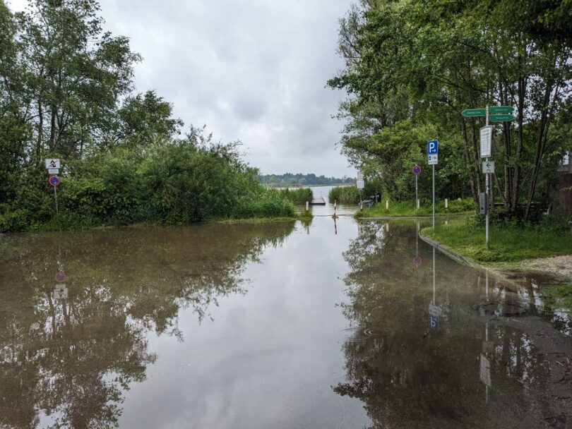 In Prien gibt es nur an vereinzelten Stellen leichtes Hochwasser, so z.B. ein Aufstau am Stettener Bach. Der Parkplatz beim Polizeisteg ist überschwemmt und ein Gully im Forellenweg kurz vor der Polizei präsentiert sich als Springbrunnen.