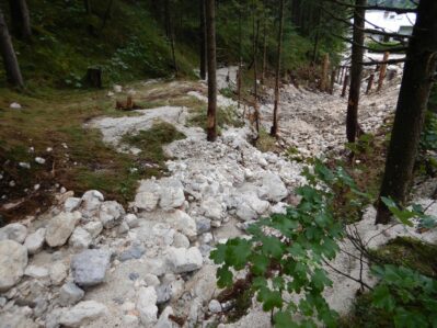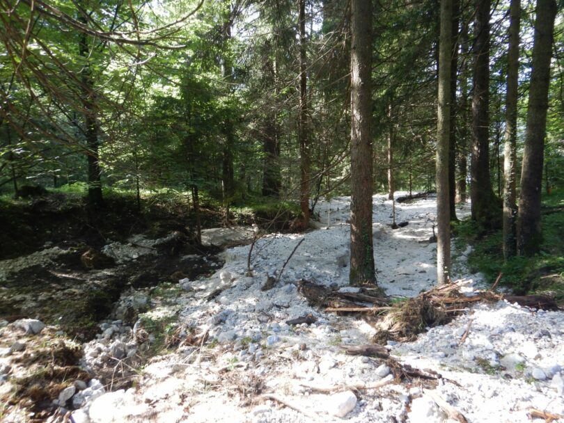 Nach dem Hochwasser 2021 – Maiswandgraben: Rund 50 Meter oberhalb der Verrohrung im Bischofswiesener Ortsteil Winkl war das Geschiebe im Maiswandgraben nach dem Unwetter im Jahr 2021 zum Stehen gekommen. Foto: Wasserwirtschaftsamt Traunstein