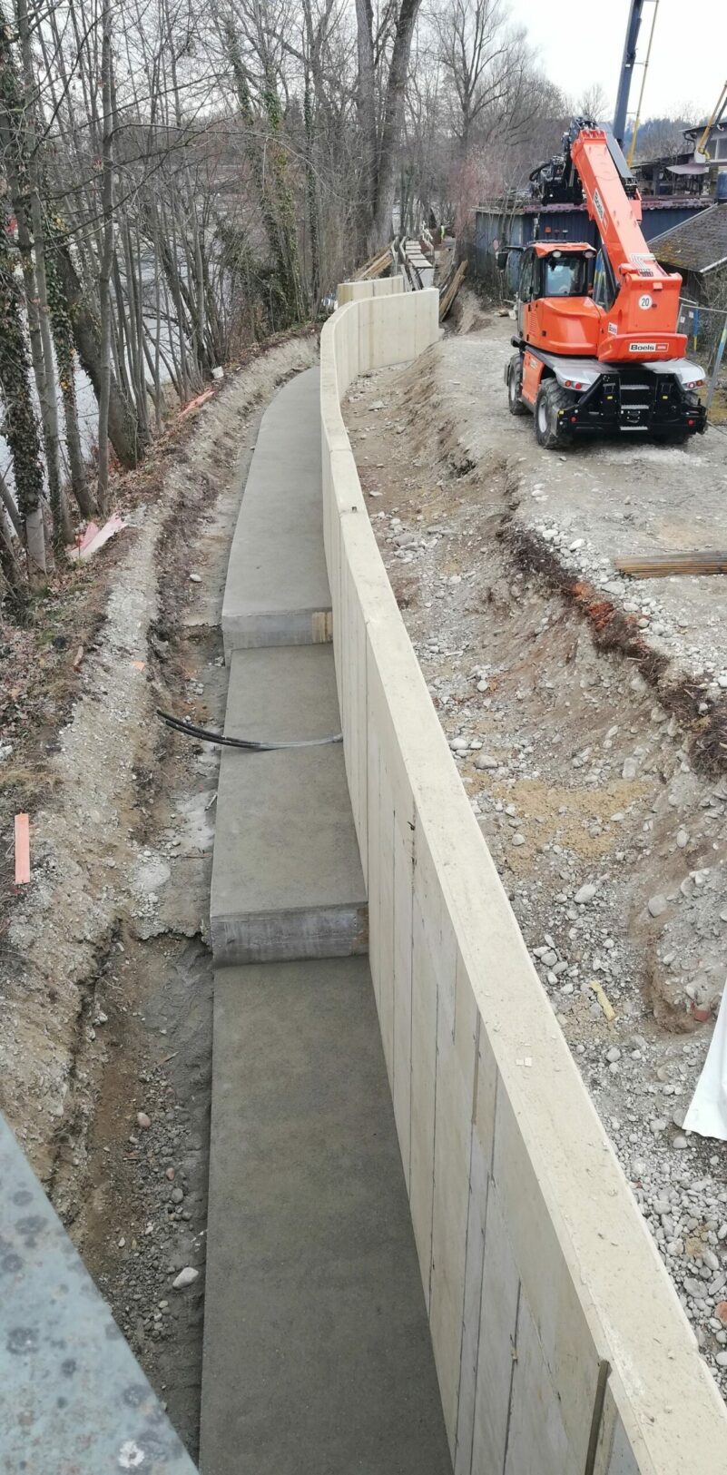 Bericht und Fotos: WWA Traunstein – HWS Trostberg Mauerbau Saliterau: Der Bau der Hochwasserschutz-Mauer im Trostberger Ortsteil Saliterau kommt gut voran. Sind die Bauarbeiten abgeschlossen, wird über Gelände nur wenig von der Mauer zu sehen sein.