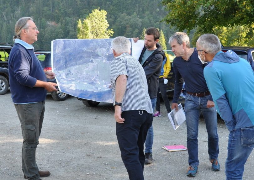 Im Einvernehmen mit dem Ersten Bürgermeister der Gemeinde Unterwössen Ludwig Entfellner (CSU) hatte der Zweite Bürgermeister der Gemeinde Unterwössen Johannes Weber (CSU) kürzlich einen Vororttermin zur Vorstellung des aktuellen Planungsstandes im Hinblick auf die baulichen Hochwasserschutzmaßnahmen in Oberwössen, Hinterwössen und Brem organisiert und dazu eingeladen. So kamen beim Parkplatz am Kinderspielplatz in Hinterwössen neben den beiden Bürgermeistern der Geschäftsleiter der Verwaltung der Gemeinde Unterwössen Thomas Müllinger, vom Wasserwirtschaftsamt (WWA) Traunstein Baurat Johann Semmler als Leiter des Sachgebietes P2 “Wildbäche” der Planungsabteilung und Projektleiter Roman Lindenthaler, vom Ortsverband Oberwössen im Bayerischen Bauernverband dessen Vorsitzender Johann Loider junior, von der Freiwilligen Feuerwehr Oberwössen der Gemeinde Unterwössen deren Erster Kommandant Korbinian Mühlberger und vom Wasserbeschaffungsverband Oberwössen dessen Vorsteher Walter Bauer, zugleich Geschäftsführer der Elektrizitätswerk Oberwössen eG und Gemeinderatsmitglied für die Oberwössener Wählergruppe (OWG) zusammen. Teilgenommen haben des Weiteren die Gemeinderatsmitglieder Katharina Wagner (zugleich Stellvertretende Fraktionssprecherin für die CSU), Gabriele Neubert (zugleich Fraktionssprecherin für Bündnis 90/Die Grünen), Bartholomäus Irlinger (zugleich Sprecher der und Fraktionssprecher für die OWG sowie Zweiter Vorsitzender des Verkehrsvereins Oberwössen) und Philipp Weißenbacher (Freie Wähler). Daneben eine große Schar an Bachanliegerinnen und -anliegern, vor allem Eigentümer von wohnhausbebauten Bachanrainergrundstücken.