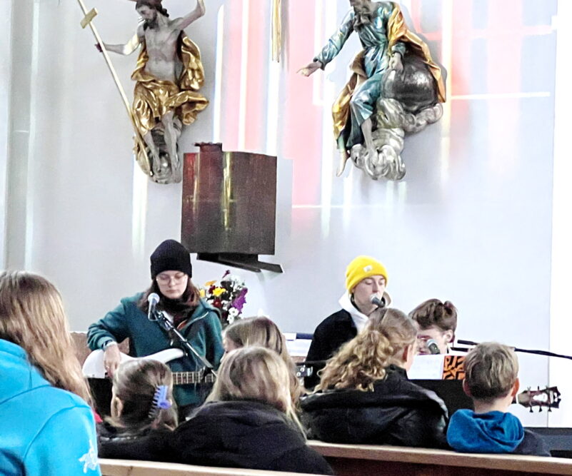 Den Mittelpunkt eines meditativen Musikgottesdienstes bildete die Musik von Konrad Raischl und seiner Band, die virtuos und einfühlsam Musik erklingen ließen, die Raischl anlässlich der Wiedereröffnung der Altöttinger Bruder Konrad Kirche im Jahre 2018 im Auftrag der dort lebenden Kapuzinermönche komponierte. Inspiriert wurde die Komposition von den Meditationstafeln, die in dieser Kirche zu finden sind. Jedes der vier eingesetzten Musikinstrumente verkörperte eine Eigenschaft von Bruder Konrad. Die von Isabell Estermaier gespielte Harfe stand für Barmherzigkeit, das Akkordeon (Udo Neubauer) für Bodenständigkeit, die Trompete (Martin Hammer) für die innige Beziehung zu Gott. Konrad Raischl erfreute das Publikum mit Gitarre und Zither, beides Instrumente, die Volksnähe und Bodenständigkeit verkörpern.