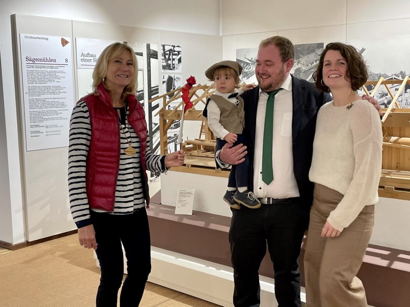Foto: Stadt Rosenheim – Helga Bichl vom Holztechnischen Museum überreicht dem Brautpaar eine rote Rose aus Holz.