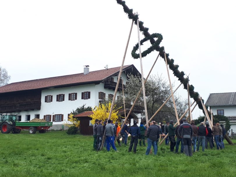 Ein genau 29,70 Meter langer, von Sebastian Wimmer aus St. Salvator gestifteter Baum wurde nach guter bäuerlicher und bayerischer Tradition in diesen Frühlingstagen vor dem Schlosser-Hof in Pinswang, Gemeinde Rimsting aufgestellt. Dies geschah zu Ehren des Brautpaars Sepp und Franziska Wimmer, deren Hochzeit am 4. Mai stattfinden wird. Für das Bringen des Baumes und für das Aufstellen zeichneten junge Männer vom Trachtenverein „Ratzingerhöhe“ Greimharting mit weiteren Burschen aus den Ortsvereinen und von der Nachbarschaft verantwortlich. Nachdem alles gut gegangen war und der stattliche, schön geschmückte Baum seine senkrechte Position eingenommen hatte, lud das Brautpaar zu einer Brotzeit in den Bauernhof ein.