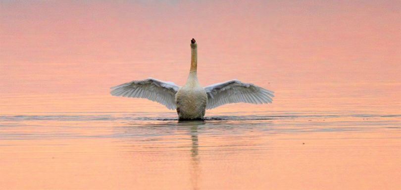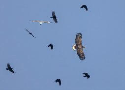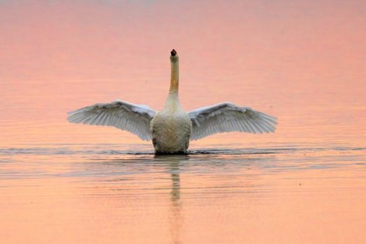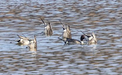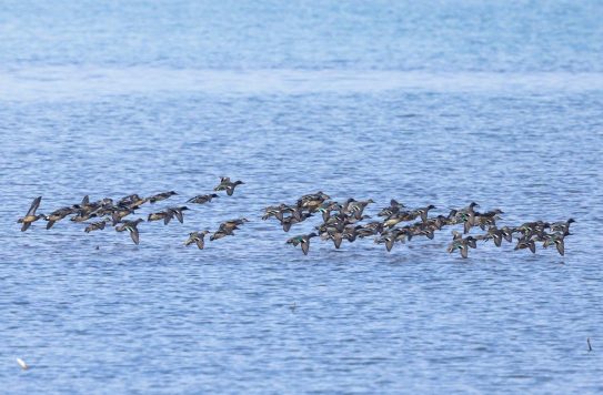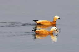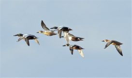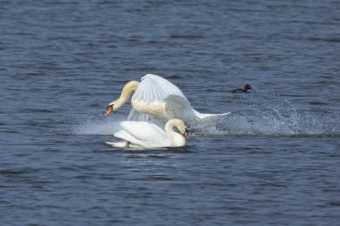 Löffelenten überquerten in kleinen Schwärmen die Bucht. Ein Tüpfelsumpfhuhn überraschte die Turmbesucher als erster Afrikaheimkehrer. Der Seeadler saß stoisch über vier Stunden auf seiner Sitzwarte am westlichen Ufer bis zum Einbruch der Dämmerung. Im Licht der untergehenden Sonne imponierte ein Höckerschwanmännchen. Ein Rostganspaar gründelte in großer Entfernung vom Turm. Am nächsten morgen hoffte ich bei klarerer Sicht, die Rostgänse fotografieren zu können. Sie taten mir den Gefallen und schwammen im besten Fotolicht unmittelbar am Turm vorbei. Zahlreich Krickentenerpel flogen bei jeder Störung durch Großmöwen oder Rabenkrähen im Schwarm über den See. Der Seeadler versuchte zweimal sein Jagdglück, wurde jedoch durch Rabenkrähen und Großmöwen heftig attackiert und strich erfolglos ins Delta ab. Eine große Anzahl Spießenten gründelte im Ostbereich der Bucht, während ein Höckerschwanmännchen einem jungen Weibchen seine Kraft demonstrierte.
