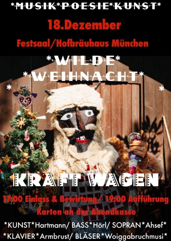 Das Ensemble KRAFT WAGEN wagt es in diesen Zeiten einen Abend voller Musik, Poesie und Kunst auf die Bühne zu bringen. Eine Weihnachtslegende. Nach dem Motto, wenn es weihnachtet ist die Freude und Hoffnung unter uns! Der Abend Wilde Weihnacht ist eine fabelhafte Mischung aus Klassik, Jazz, Folklore und einer künstlerischen Ausstattung. Lassen Sie sich überraschen und verzaubern.