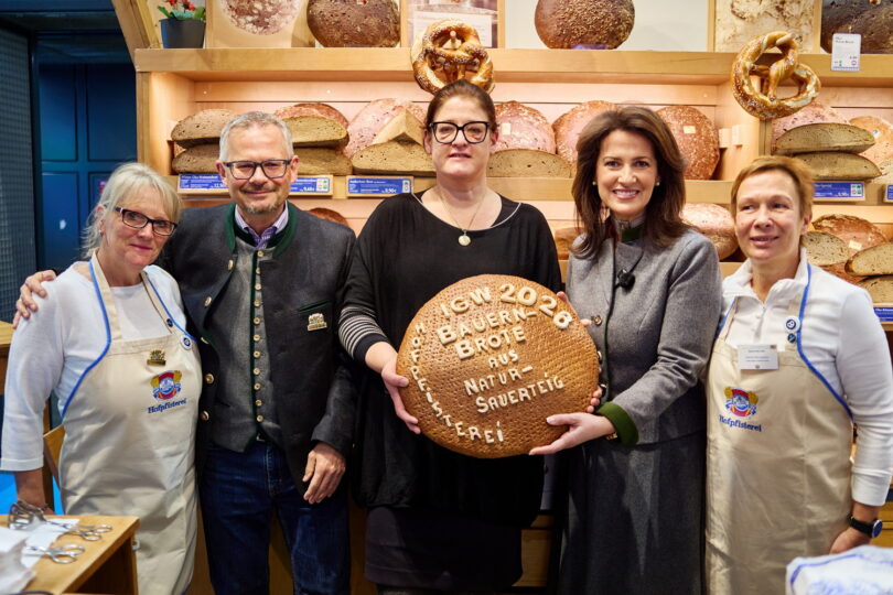 Bericht und Foto: Bayerisches Landwirtschaftsministerium  / Henning Schacht – (v.l.n.r.) Anne Aigner, Thomas Lillpopp, Nicole Stocker, Bayerns Landwirtschaftsministerin Michaela Kaniber, Sabine Königstein am Stand der Hofpfisterei Ludwig Stocker GmbH in der Bayernhalle.