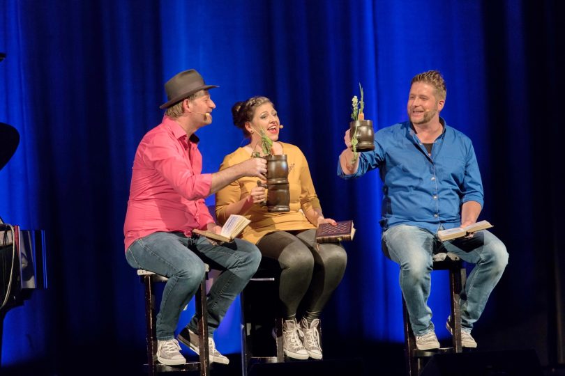 Der Kabarettist, Multiinstrumentalist und Autor Tom Bauer ist bekannt für sein Talent, die bairische Sprache mit viel Witz und in Reimform auf die Bühne zu bringen. Mit Veronika Frank und Sebastian Hagengruber hat er sich zwei Bühnenprofis ins Boot geholt, die mit Witz und Charme in zehn unterschiedliche Rollen schlüpfen und dabei auch noch dreistimmig singen.