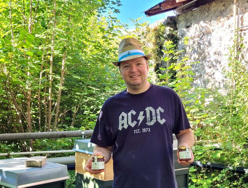 Auf vielen unserer Felder und Wiesen reicht oftmals das Nahrungsangebot durch Monokulturen mit kurzer Blütephase einfach nicht mehr aus, deshalb suchte Imker Christian Lackner aus Aiging zusätzlich einen Platz in der Stadt.  Fündig wurde er beim Hofbräuhaus Traunstein, zehn seiner Bienenstöcke stellte er dort an der alten Stadtmauer hinter der Brauerei auf.  Seine Bienenvölker sammeln Traunsteiner Nektar und Pollen rund um die Brauerei und  aus den vielen liebevoll gepflegten Blumenkästen und den Gärten der Stadt. Sie finden  von März bis Oktober ein reiches und weitgehend chemiefreies Nahrungsangebot. Christian Lackner ist seit 12 Jahren Imker, seine Bienenvölker hegt und pflegt er mit viel  Fachwissen und Leidenschaft, mehrmals in der Woche schaut er auch beim Hofbräuhaus  Traunstein vorbei. Die Abfüllung des „Hofei-Honig“ aus seiner bisher besten Ernte mit insgesamt 300 Kilo fand in der ersten Augustwoche statt, angeboten wird das Traunsteiner Naturprodukt über den Online-Shop des Hofbräuhaus Traunstein sowie im Brauereiladl in der Traunsteiner Hofgasse.