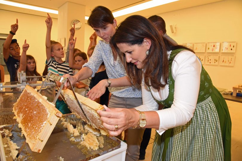 Zu einer lehrreichen “Biologiestunde” mit anschließendem Honigschlecken hatte Landwirtschaftsministerin Michaela Kaniber die dritte Klasse der Münchner Grundschule Amphionpark in ihr Ministerium eingeladen. Alles drehte sich um das Thema Bienen – und für die Kinder gab es nicht nur viel zu hören und zu staunen, sie durften auch kräftig mit anpacken. Schließlich mussten vor der süßen Nascherei erst die Bienenkästen entdeckelt, die Waben entnommen und der Honig geschleudert werden. Alles unter fachkundiger Anleitung von Imkerin Elisabeth Sommersgutter. Der Honig stammt von den Stadtbienen im Vorgarten des Ministeriums. Kaniber hatte sie im Frühjahr dort angesiedelt, um auf ihre unverzichtbare Rolle für den Erhalt der Artenvielfalt und der natürlichen Lebensgrundlagen aufmerksam zu machen. “Wir müssen schon Kindern und Jugendlichen den großen ökologischen Wert unserer Bienen bewusst machen”, so die Ministerin.