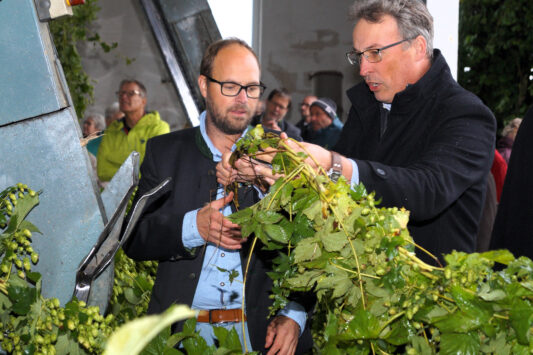 Nach der Begrüßung durch den ELF-Kreisvorsitzenden Michael Modlmeier und dem Betriebsleiter Johann Nißl begann die Führung durch den Betrieb, welchen Fam. Nißl bereits in vierter Generation führt. Der Weg führte die Besucherinnen und Besucher zur Hopfenhalle, wo Johann Nißl spannende Einblicke in den Anbau, die Ernte und die Verarbeitung des Hopfens gab. Sein Fachwissen und die anschaulichen Erklärungen vermittelten einen beeindruckenden Einblick in die Welt des Hopfenanbaus. Ganz Mutige, welche dem Regen trotzten gingen noch in den angrenzenden Hopfengarten. Derzeit werden die Hopfensorten „Hallertauer Tradition, Perle, Herkules und Titan“ angebaut. Titan ist eine neue Hüller Zuchtsorte, welche eine mehltauressistente und klimatolerante Hochalphasorte mit guter Brauqualität ist. Für den Hopfenpflanzer erleichtert die Sorte Titan den Anbau aufgrund seiner besseren Widerstandsfähigkeit und dem geringeren Pflanzenschutzmitteleinsatz.