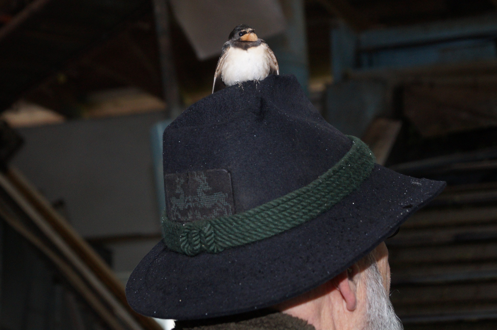 Schwalbe auf Kopf von ELF-Bezirksvorstandsmitglied Walter Ulrich