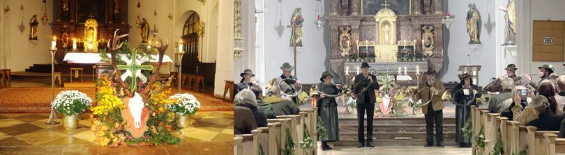 „An den drei Tagen nacheinander, wenn wir Allerheiligen, Allerseelen und den Heiligen Hubertus feiern, dann können diese Feste helfen, dass wir unseren Horizont weit machen. Denn unser Leben und unsere Lebensbedingungen verdanken wir den Vorfahren, die für uns die Grundlage für Heimat und Lebensraum geschaffen haben. Und dabei wollen wir den Schöpfer und Herrgott nicht vergessen“ – mit diesen Worten begann Pfarrer Paul Janßen die Feier einer Hubertusmesse der Jägervereinigung Rosenheim e.V. in der Kirche „Darstellung des Herrn“ in Aschau i. Chiemgau.