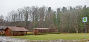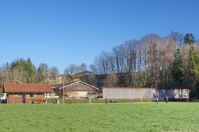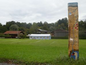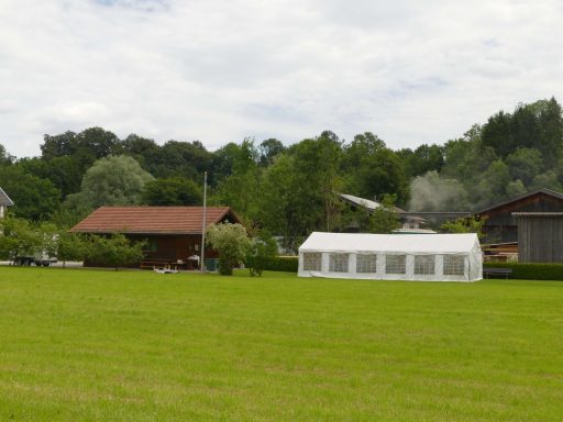 Fotos: Hötzelsperger – Blick auf den Hufeisen-Wurfplatz in Prien-Kaltenbach mit Darstellung der zukünftigen Überdachung für den Trainingsplatz – zum Teil mit dem Festzelt als Größenvergleich, das bei den traditionellen und internationalen Hufeisenwettbewerben aufgestellt wird.