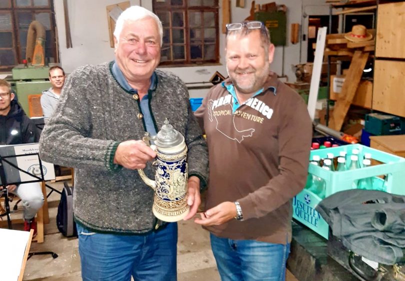 Architekt Helmut Birner hat am 7.10.2021 die Musikantinnen und Musikanten der Musikkapelle Schleching in der Musikprobe mit einem historischen Bierkrug überrascht.