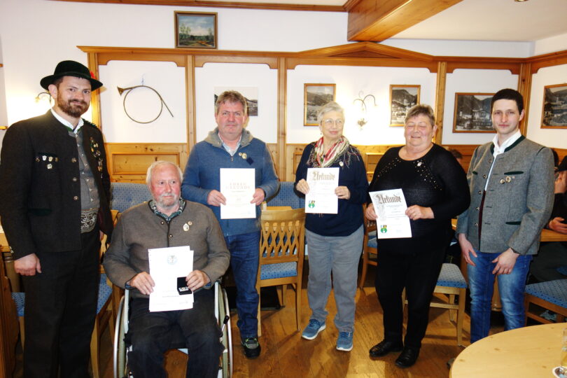 Gauschützenmeister Andreas Wimmer (links) ehrte unter Assistenz von Schützenmeister Stefan Putzhammer (rechts) Heinrich Hauser (von links) und Stefan Bichl für 50- beziehungsweise 40-jährige Mitgliedschaft sowie Susanne Zink und Elisabeth Loider für treue Mitarbeit.