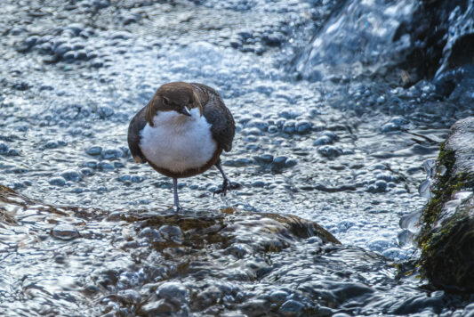 Erst sieht man nur einen weißen Fleck im Wasser, bis man entdeckt, dass dies die weißen Brustfedern der Wasseramsel sind. Nicht nur diese weißen Brustfedern sind markant für die Wasseramsel, sie kann auch erstaunlich gut tauchen und schwimmen. Dies ist sehr gut entlang der Prien zu beobachten, da fließende, steinige Bäche und Flüsse ihr Lebensraum sind. Auch ein Graureiher stakste im Wasser, auf der Suche nach Nahrung und Stockenten ließen sich flussabwärts treiben, an diesem sonnigen, kalten Wintertag.