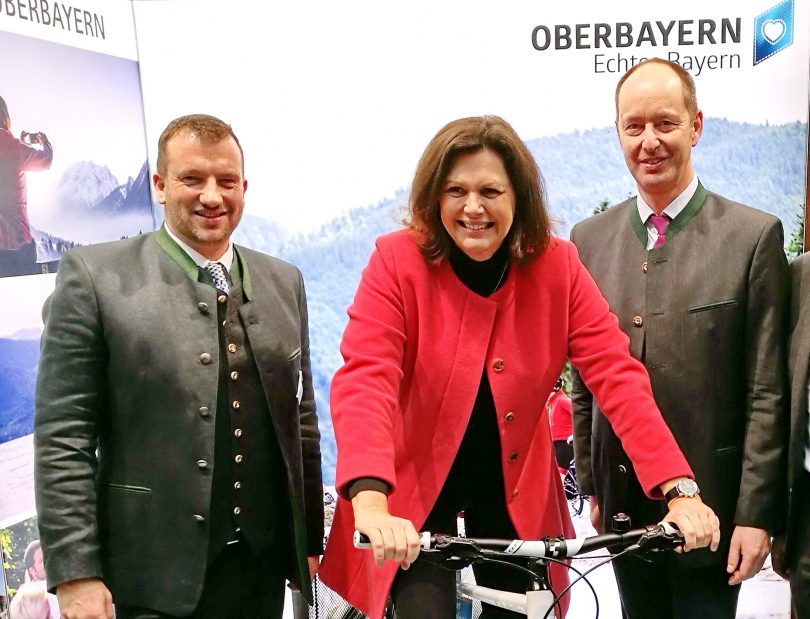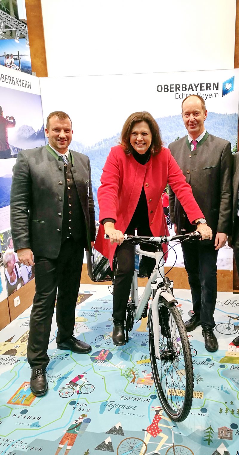 Besonderes Interesse zeigte die bayerische Staatsministerin für die „WasserRadlWege Oberbayern“, einem neuen, oberbayernweiten Fernradweg, der ausgehend vom Münchener Viktualienmarkt in drei Themenschleifen durch die verschiedenen Regionen Oberbayerns führt. Neben dem vielseitigen Wassererlebnis als ständigen Begleiter werden drei ebenso spannende wie abwechslungsreiche Routenthemen aufgegriffen, nämlich Salz im Südosten, Kunst & Kultur im Südwesten und Hopfen & Bier im Norden Oberbayerns.