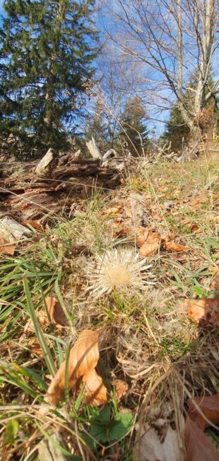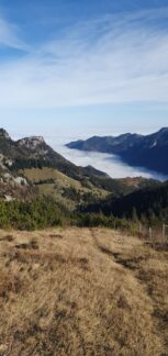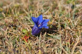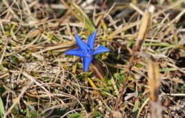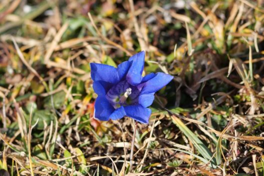 Auf den Wiesen herrscht zwar ein Braunton vor, aber man findet neben vielen Frühlingsenzianen auch schon einige Clusius Enziane und weitere Blumen, etwa die Witwen-Blume oder der Ochsenkopf.