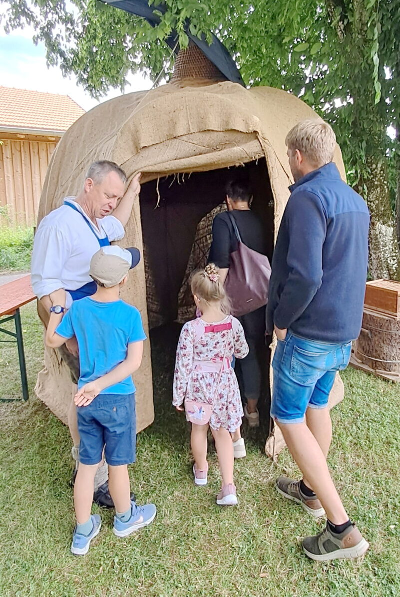 Auch dieses Jahr kamen wieder sehr viele Besucher zum Imkertag nach Niederbrunn. Das bunte Programm hatte ja einiges zu bieten. Im Schaubienenstand haben sich nicht nur die Bienen in ihren Kästen getummelt, sehr viele Interessenten hat das Geschehen in dem Holzhaus angelockt. Dem Imker Simon Voit hautnah bei seiner Arbeit zuzuschauen und mit ihm über Bienen, Honig und Bienenwachs zu sprechen wir sicherlich ein beeindruckendes Erlebnis, genau so wie der begehbare Bienenkorb, der im Garten des Hilgerhofes aufgebaut war und in dem das Treiben eines Bienenvolkes aus nächster Nähe zu beobachten ist.