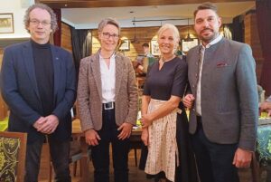 Zum immateriellen Kulturerbe informierten bei der Versammlung der Forstberechtigten im Chiemgau Dr. Helmut Groschwitz, wissenschaftlicher Mitarbeiter am Institut für Volkskunde der Bayerischen Akademie der Wissenschaften in München und Kunsthistorikerin Dr. Birgit Löffler, die im Landratsamt Traunstein Sachgebietsleiterin für Kultur und Heimatpflege ist, daneben Geschäftsführerin Maria Stöberl und der erste Vorsitzenden des Verbandes der Forstberechtigten, Landrat Siegfried Walch. Foto: Giesen