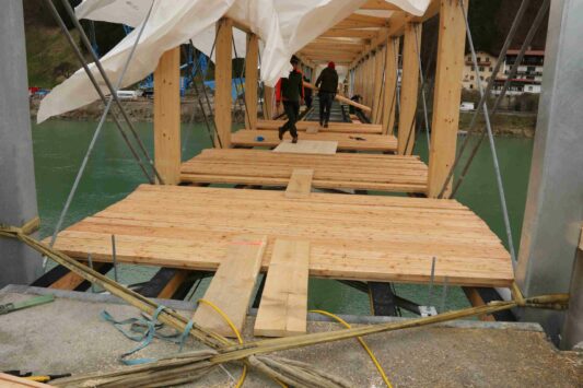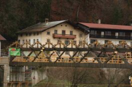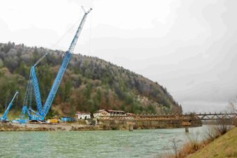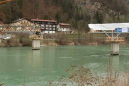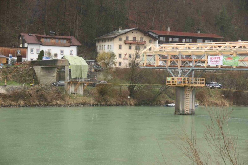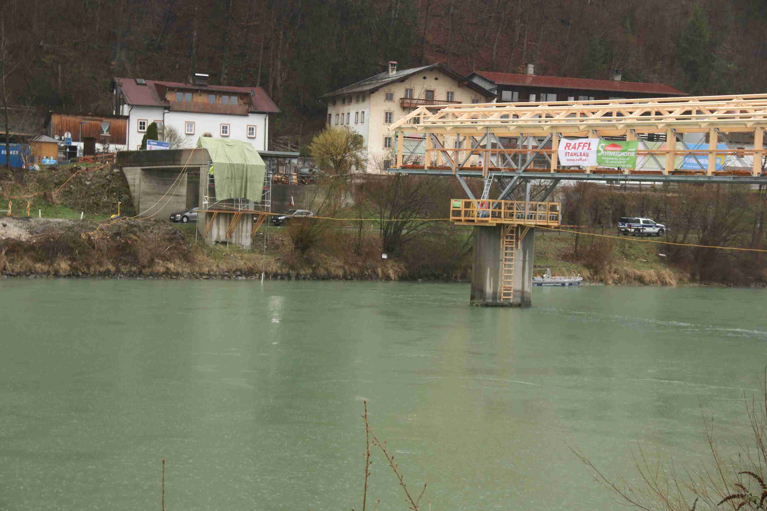 Die aktuellen Bilder von den Bauarbeiten an der neuen Brücke von Erl nach Niederaudorf zeigen unter anderem schwerstes Arbeitsgerät, die die Brückenteile eingehoben haben sowie Reste der alten Brücke, die Lücke von Neu-zum Altbestan sowie die Arbeiten der Handwerker.