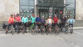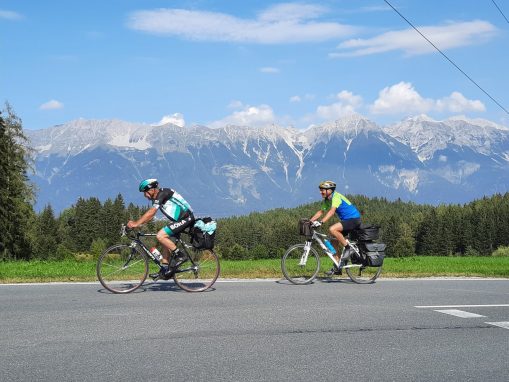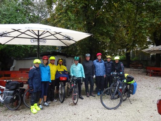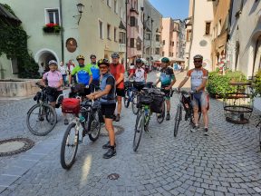 Aufgesattelt waren Tourenräder, Rennräder und Mountainbikes, alle ohne Strom und mit eigenem Gepäcktransport auf dem Rad. Der Start erfolgte frühmorgens bei tiefstem Nebel am Rosenheimer Bahnhof. Nach einer kurzen Sicherheitsunterweisung durch Reinmund ging es 95km am Innradweg entlang bis zum ersten Tagesziel nach Schwaz. In Kufstein zur Mittagspause war der Nebel verschwunden und die Sonnenstrahlen erwärmten die hungrigen Radler. Ein zweiter Kaffee-Stopp folgte 30 km später in der historischen Altstadt von Rattenberg. Nochmal 20km und die Unterkunft war erreicht.