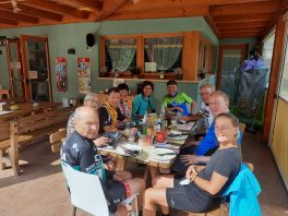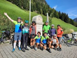 Der zweite Tag begann recht flach bis Hall i. Tirol. Ab da begann der lange Anstieg auf der alten Römerstraße bis hin zum 1.370 m hoch gelegenen Brennerpass. Über Ampass und Patsch bis zum Etappenziel nach Steinach am Brenner führte die mit herrlichen Ausblicken gespickte Strecke. Bis dahin waren es zwar nur 55km, aber schon 850 Höhenmeter. Die Gruppe war recht fit, insbesondere der 79-jährige Willi beeindruckte mit seinem 40 Jahre alten Fausto Coppi Rennrad die übrigen Mitradler. So wurde schon recht früh die Unterkunft in Steinach erreicht. Was tun mit der restlichen Zeit? Kurzentschlossen hielt Josefine eine Gymnastikstunde mit Mobilisations- und Dehnungsübungen auf der Hotelwiese ab, um die strapazierten Muskeln für die nächsten Tage wieder auf Vordermann zu bringen. Im beheizten Schwimmbad konnten sich dann alle vollends entspannen.