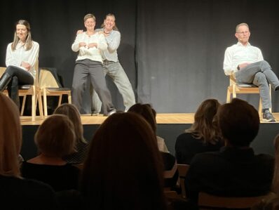 Die „Improfeten mit -f-“ im Kulturhof Stanggass waren unterhaltungstechnisch eine Wucht. Wer gerne Tränen lacht – und wer möchte das nicht -, ist bei dieser Truppe um Theaterpädagogin und Improvisationsschauspielerin Sandra Meier richtig. Mit dabei waren Steffi Ritter, Laura Gabler und Thomas Stegmann. Für die passend-untermalende Hintergrundmusik sorgte Luki Häusleigner an der Gitarre. Sandra Meier versprach „ein Feuerwerk der kleinen Premieren“.