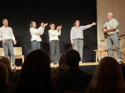 In verschiedenen Formaten jonglierte die Truppe jede Art von Comedy und Witz durch den Abend und ließ das Publikum einzählen: „5 – 4 – 3 – 2 – 1, Improfeten mit -f-!“. Besser kann man einen ganzen Saal nicht aufheizen. Mit Ideenreichtum, Spontaneität, Flexibilität und Sprachgewandtheit unterhielten sie die Menschen lustvoll und kreativ. Begonnen wurde mit dem ABC-Format, bei dem jeder Halbsatz nach der Buchstabenfolge des Alphabets beginnen musste. Den Inhalt dieser Sätze legte wiederum das Publikum fest. Schließlich ging es um die Oma, die man aus dem Keller holen wollte. Wie aus der Pistole geschossen, kamen die Ideen. Zum Brüllen komisch. Dann das Vorstellungsgespräch für den Job des Kläranlagentauchers. Keine der Bewerberinnen mit Mehrfachrollen wusste, wofür sie sich bewarb. Durch eine geschickte Fragestellung – „Haben Sie Kinder? Kennen Sie sich mit Scheiße aus?“ Oder „Waren Sie schon mal in Ägypten?“ – dirigierte der Personalchef Thomas Stegmann die Damen in die richtige Richtung.
