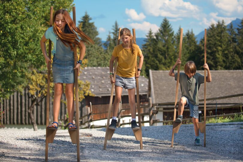 Glentleiten_Stelzen_Gerard1.jpg: Neben den Kursen und Aktionen können Kinder auch viele andere Dinge im Freilichtmuseum Glentleiten erleben, zum Beispiel mit Stelzen durchs Gelände spazieren.