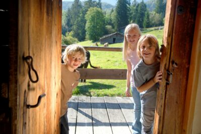 FLM_Glentleiten_Gerard_Almtür1.jpg: Neugierig wie diese Kinder können alle Jungen und Mädchen auf das Programm während der Sommerferien sein. Es verspricht Spiel, Spaß und Freude am Werkeln!