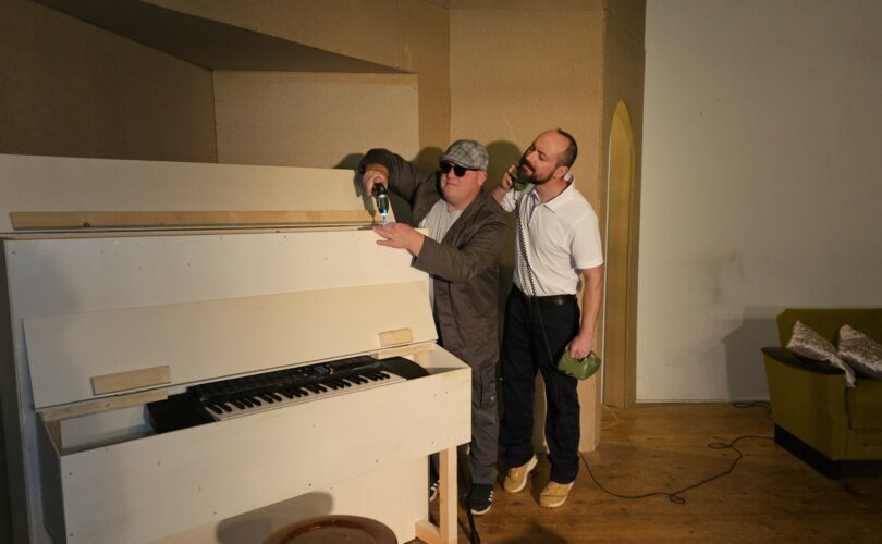 Bildunterschrift: Die Theaterer von Hittenkirchen sind bereits fleißig beim Proben. Das Szenenbild zeigt Lenz Böglmüller (links) als Klavierstimmer Herr Pfeiffer und Wolfgang Schuster als Notarzt Dr. Kommissari.