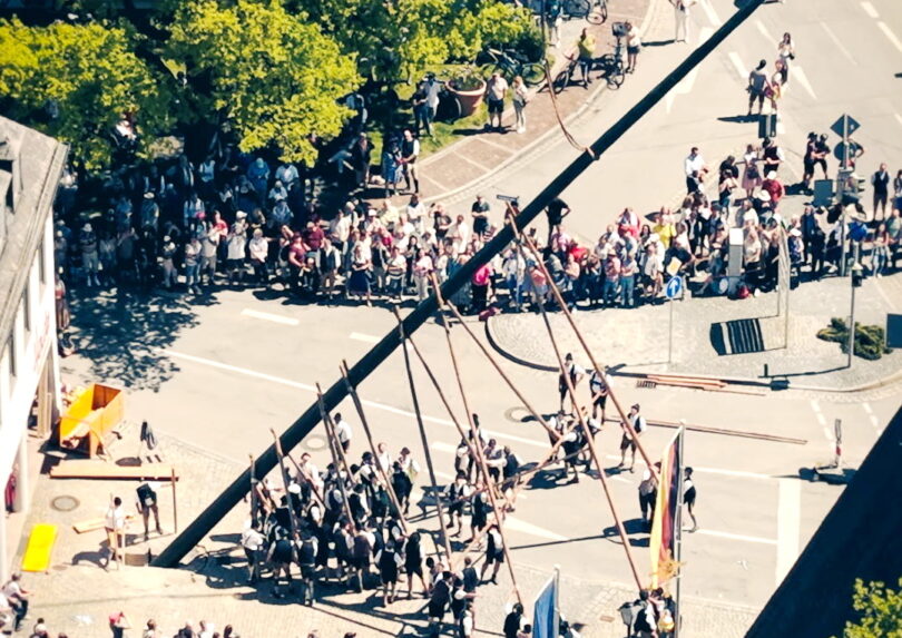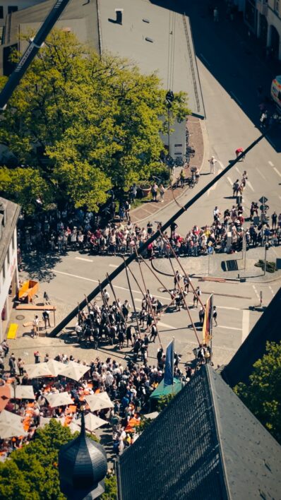 Bericht und Bilder: Markt Prien a. Chiemsee – Sonnige Gemüter bei herrlichem Maiwetter: Mit Muskelkraft erhielt der Priener Marktplatz am vergangenen Donnerstag wieder einen Maibaum.