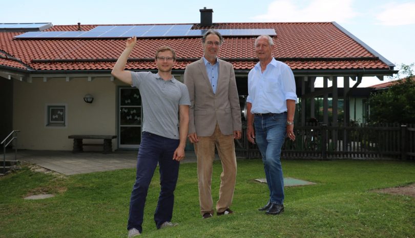 Bericht und Foto: Heinrich Rehberg – Bildunterschrift: Der Vorsitzende der „Bürgerenergie Chiemgau e.G.“ David Schmidtner, Bürgermeister Peter Solnar und der stellvertretende Vorsitzende der „Bürgerenergie Chiemgau e.G.“ Philipp Ramming, bei der Übernahme der Bürgersolaranlage an der Kindertagesstätte „Spatzennest“ in Aschau (von links)